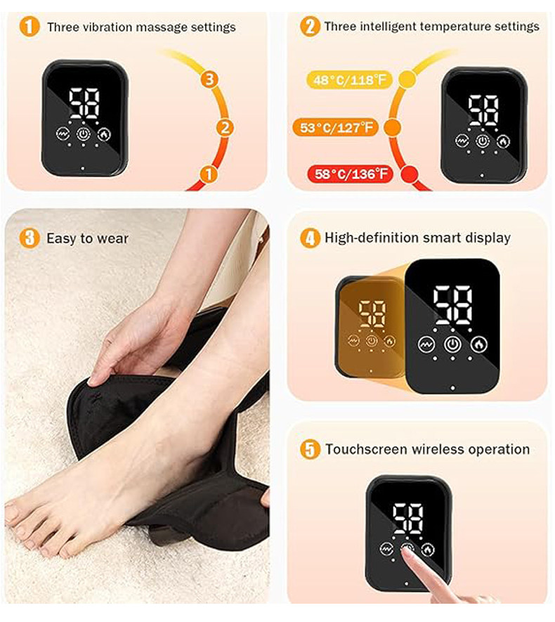 A: The massager combines gentle vibration massage with soothing heat to support foot wellness. The vibration motor delivers rhythmic pulsations that may help promote circulation to your feet and ankles, which is particularly beneficial after long periods of standing, sitting, or physical activity. The integrated heating function provides warmth that helps relax tired foot muscles and enhances overall comfort. The adjustable wrap design delivers gentle compression around the entire foot and ankle area. Many users find that 15-20 minute sessions help reduce the feeling of foot fatigue, support better circulation, provide warmth to cold feet, and offer relief after activities that stress the feet and ankles like walking, running, standing, or wearing uncomfortable footwear.