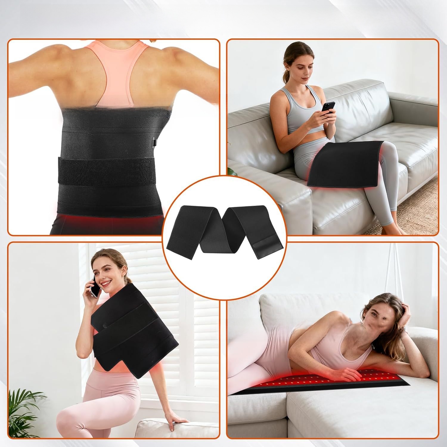 A: Absolutely! This multi-position belt works on any body area where you'd like targeted warmth and light therapy. Common applications include: lower back (lumbar support, general comfort), knees (joint support, post-activity recovery), shoulders (muscle tension, recovery support), thighs and calves (muscle soreness, post-workout recovery), neck and upper back (tension from desk work), and hip area (muscle support). The adjustable strap design ensures secure fit on various body parts and sizes.